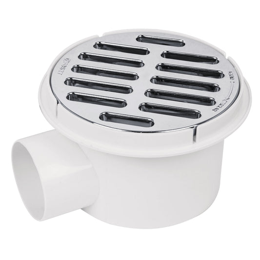 Coladera universal plástica 1/4 de vuelta con salida lateral 2" y rejilla cromada SKU:'49618